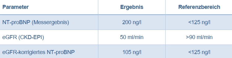 Um dem entgegenzuwirken, besteht die Möglichkeit, NT-proBNP-Werte anhand der von Luchner et al.¹ vorgeschlagenen Formel zu korrigieren: